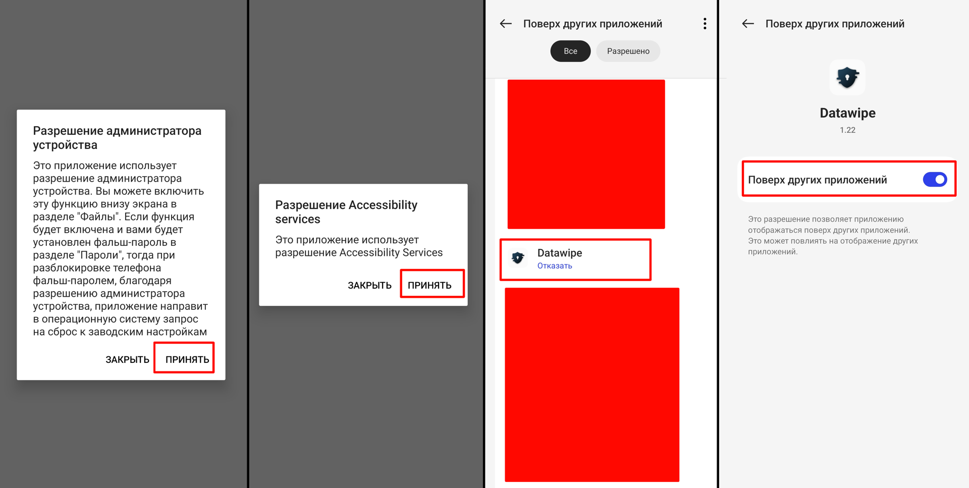 На самом деле это приложение толком не защищает наши данные. Его блокировку очень просто обойти, отодвинув шторку сверху и отключив ему возможность показываться поверх других приложений. Но в условиях досмотра вашего телефона, люди в погонах, скорее всего, не будут разбираться и искать способы обойти пароль, а просто попросят вас его ввести. Тогда-то у вас и будет возможность сбросить телефон до заводских настроек при желании.