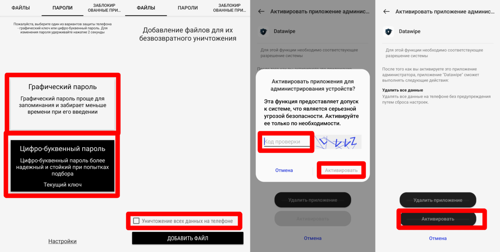 3. Выбираем тип пароля, который хотите установить (обычный цифро-буквенный пароль или графический пароль). Нам предложат выбрать две комбинации: одну настоящую для разблокировки, вторая ложная для удаления файлов или сброса устройства до заводских настроек.
