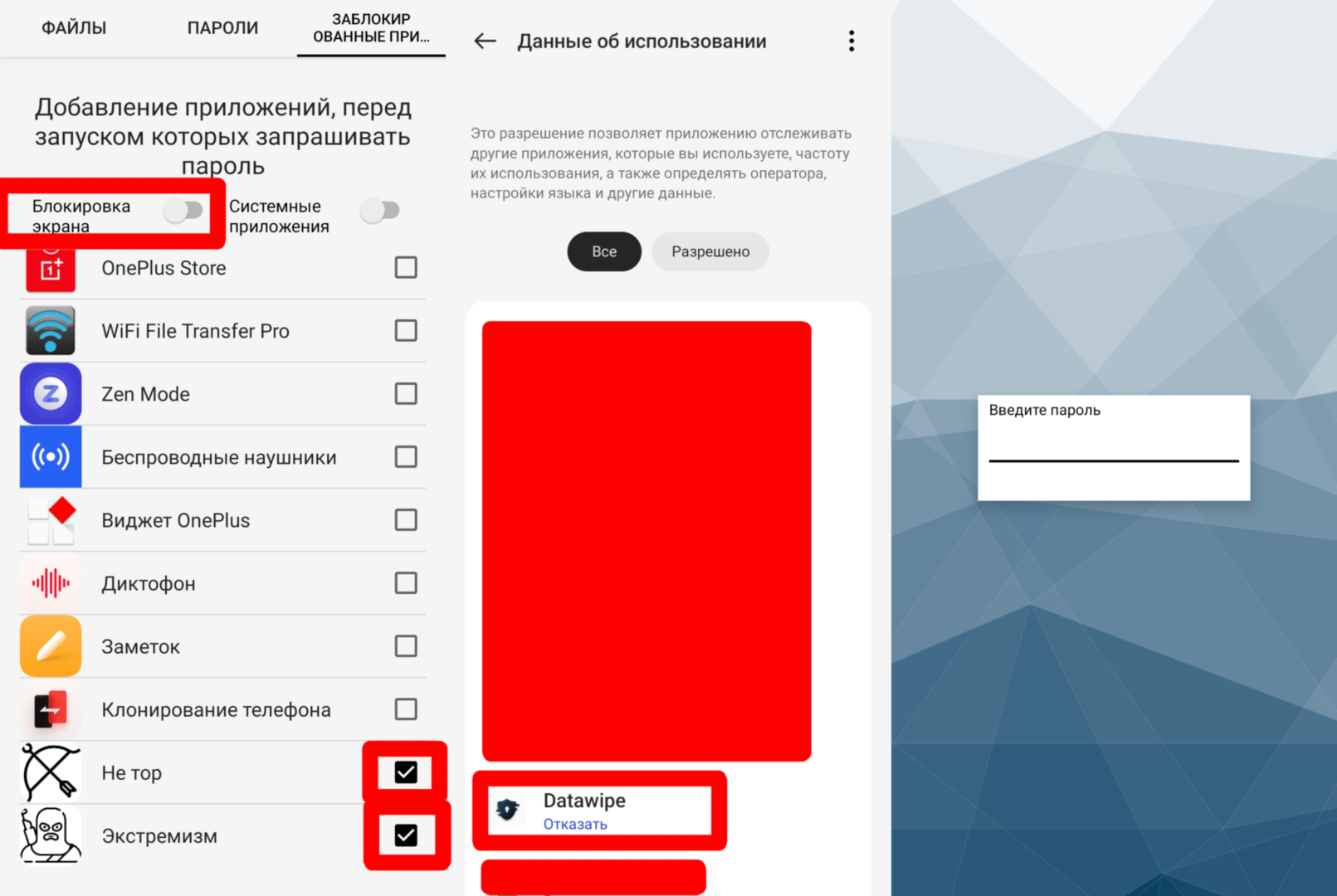 )Кастомный экран блокировки, который является последним (и одновременно первым) бастионом защиты перед людьми в погонах. Данная апка позволяет установить два пароля (пин-код или графический ключ): один для разблокировки экрана или приложения, второй - фейковый для удаления выбранных файлов или полного сброса телефона до заводских настроек. Хочу подчеркнуть, мы не проводили декомпиляцию приложения для проверки на возможные закладки и пакости от разработчика. Но худшее, что может сделать приложение - передавать куда-то личные данные, а доступ к интернету можно прикрыть приложению через настройки.