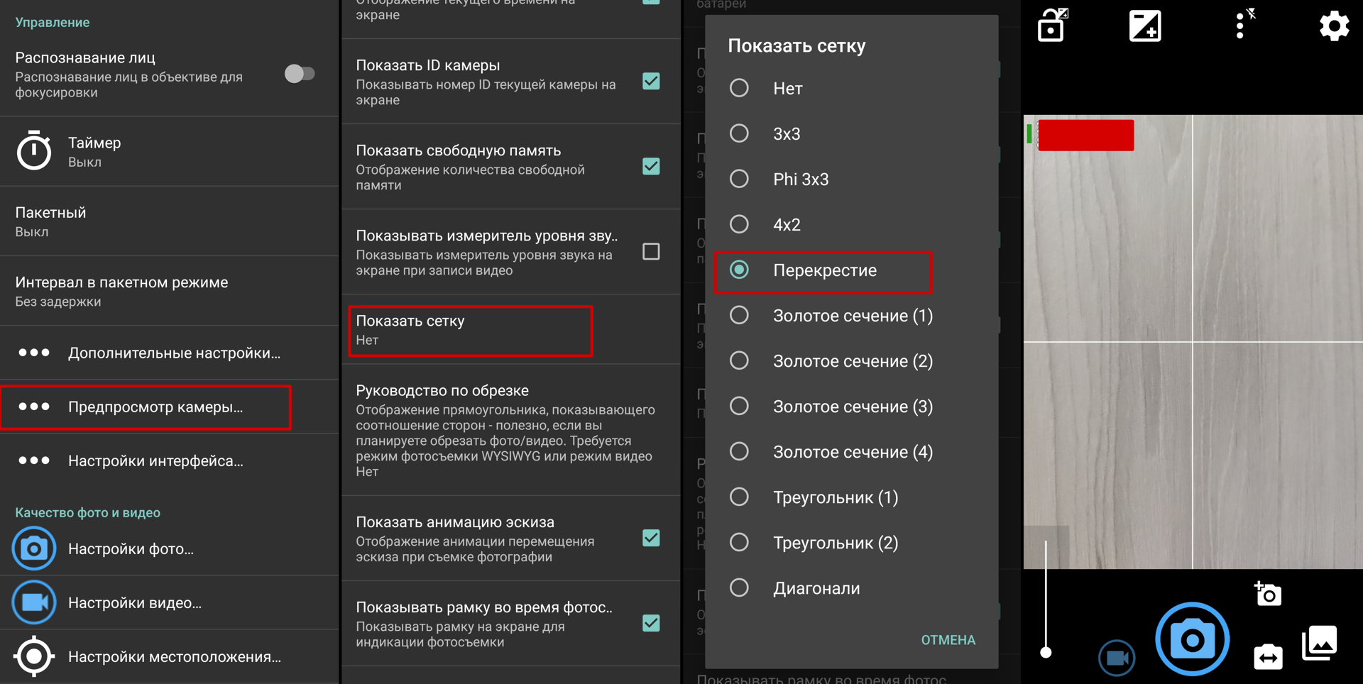 * В категории "предпросмотр камеры" нас интересует: