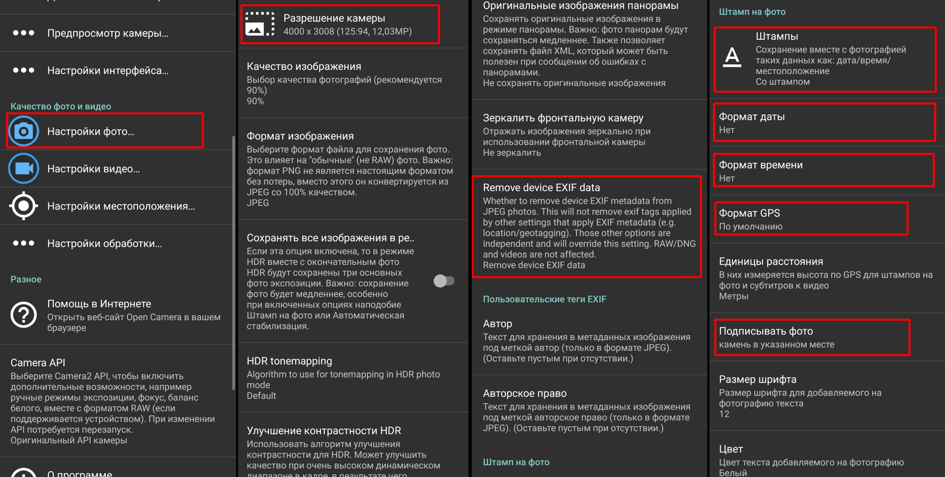 * В Категории "настройки фото" нас интересуют: