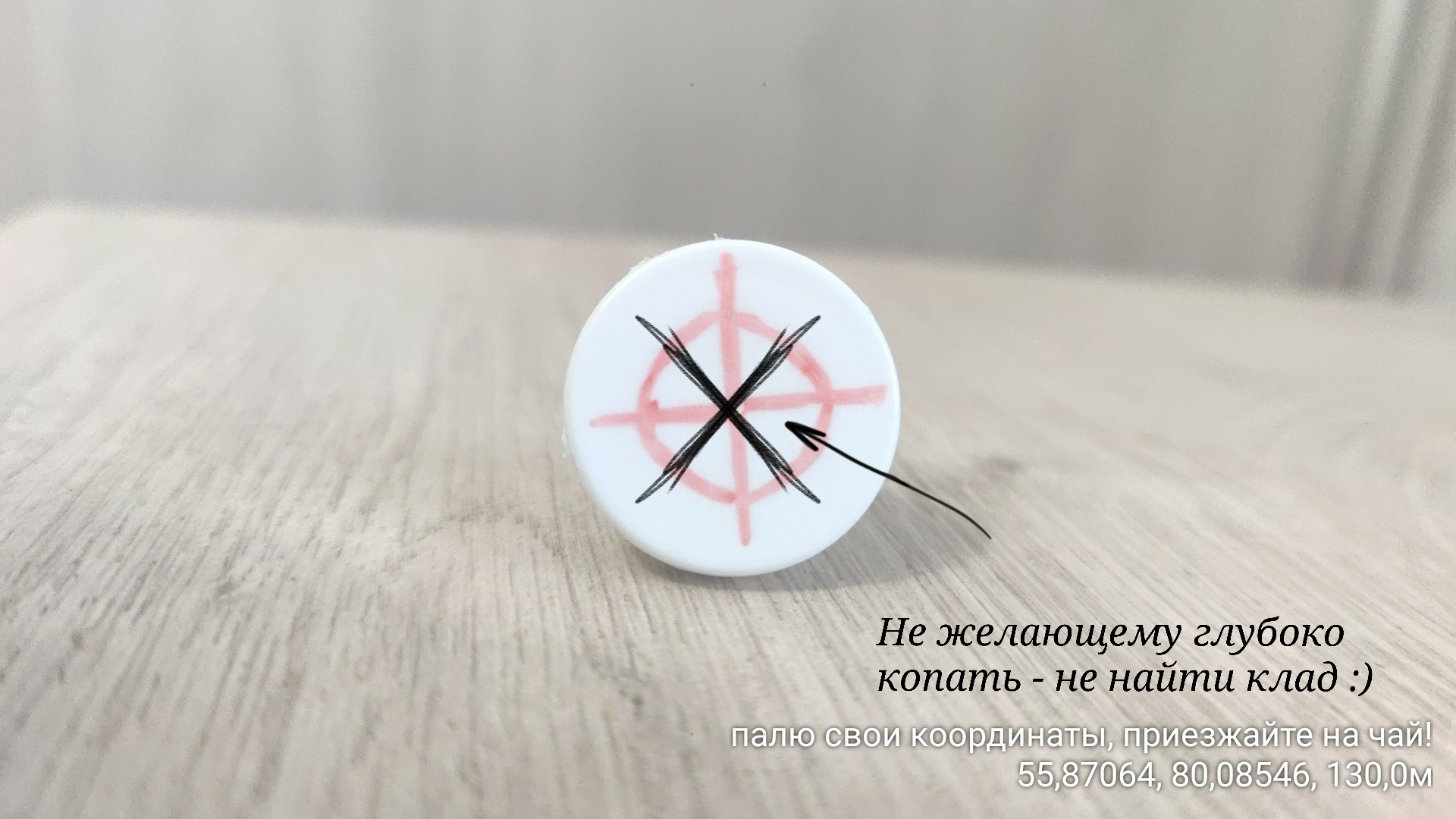 С помощью перекрестия можно целиться в точку клада, когда вы делаете ближнее фото. Так, когда вы будете заниматься обработкой фотографий, у вас не возникнет проблем с тем, чтобы вспомнить, куда именно вы положили клад (потому что клад будет всегда по центру). Если вы делаете много кладов за один день, это позволяет сосредоточиться на окружающей обстановке, а не на обработке фото в моменте нахождения на улице или запоминании точки клада.