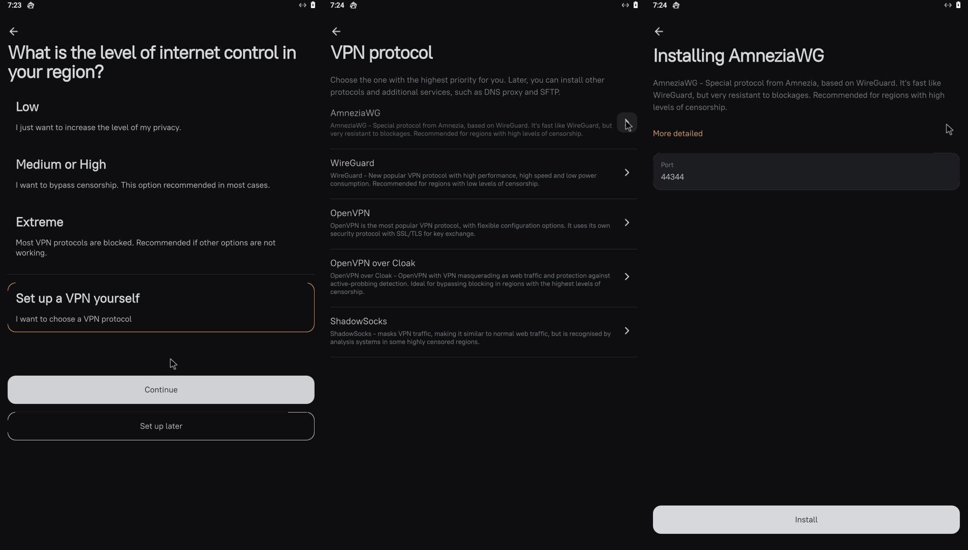 6. Выбираем VPN протокол, рекомендую выбирать AmneziaWG или OpenVPN over Cloak, если у вас есть проблемы с блокировками.