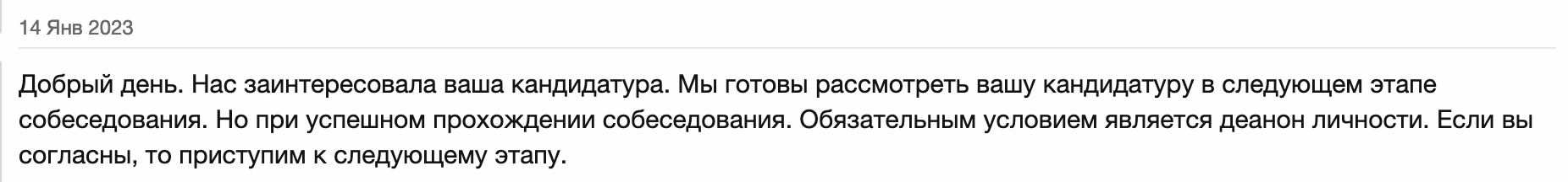 Вернемся к вопросу "Деанон/Залог" - мне непонятно, зачем было спрашивать в начальном списке вопроса про деанон и залог, если деанон обязателен. Зачем было продолжать собеседовние, если я уже указал, что деанон исключен. Это очень странные вещи. Полагаю, что это такая стратегия, посеять надежду в человеке, что можно устроится по залогу например, или как в моем случае - "с репутацией". Я о том, что часто люди, которые обращаются к предложениям о работе максимально цепляются за него и действительно нуждаются в стабильном доходе. И когда после отправленного резюме им предлагают пройти деанон, на что большинство из них скорее всего не расчитывало, есть шанс, что посеянная надежда скажет "Ну раз подхожу, можно и попробовать" - возможно на это надеется работодатель, как бы смягчив подводку к тому, что нужен деанон. Я не осуждаю и ни в коем случае не пытаюсь кого-то оскорбить или задеть или разоблачить, это хороший метод и ничего плохого или коварного в этом нет. Просто у меня другое видение и другие методы взаимодействия с персоналом. В конце концов решение раскрывать свою личность или нет принимает человек, который проходит собеседование, а не кто-то другой.