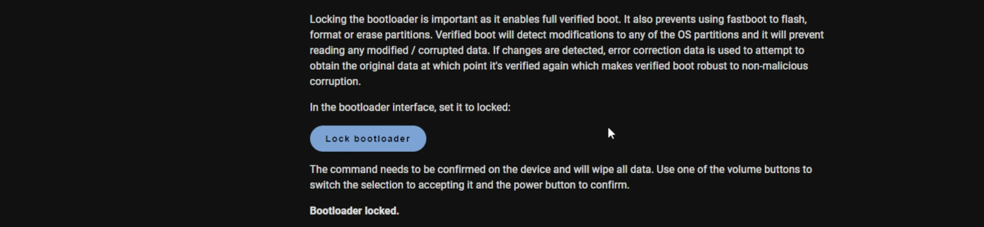 Прошивка завершена, теперь заблокируем загрузчик, для этого нажимаем на сайте кнопку "Lock bootloader", выбираем "Lock the bootloader" на устройстве и жмем конпку включения, устройство перезагрузится и мы увидим, что загрузчик снова заблокирован
